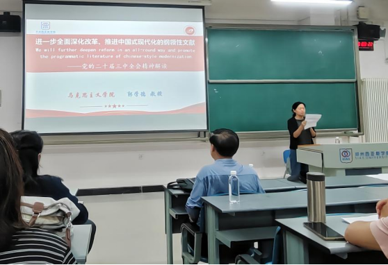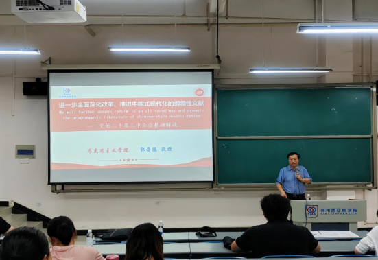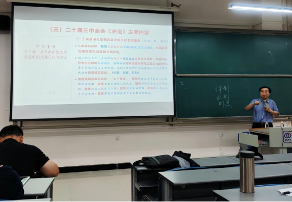 2024 年9月18日13:00 时,我院联合管理学院特邀马克思主义学院院长郭学德教授在15-113作了题为《进一步全面深化改革推进中国式现代化的纲领性文献——党的二十届三中全会精神解读》的专题讲座。管理学院院长周柯、党总支副书记赵志攀、管理学院全体教师及我院育人导师参加了此次讲座。讲座由周柯主持。
