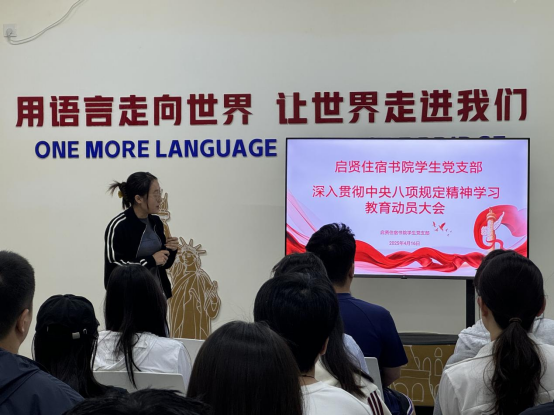 2025年4月17日,启贤住宿书院在B008召开"深入贯彻中央八项规定精神学习教育动员大会",会议由学生第一党支部书记李英君主持,全体学生党员参与本次理论学习动员会。