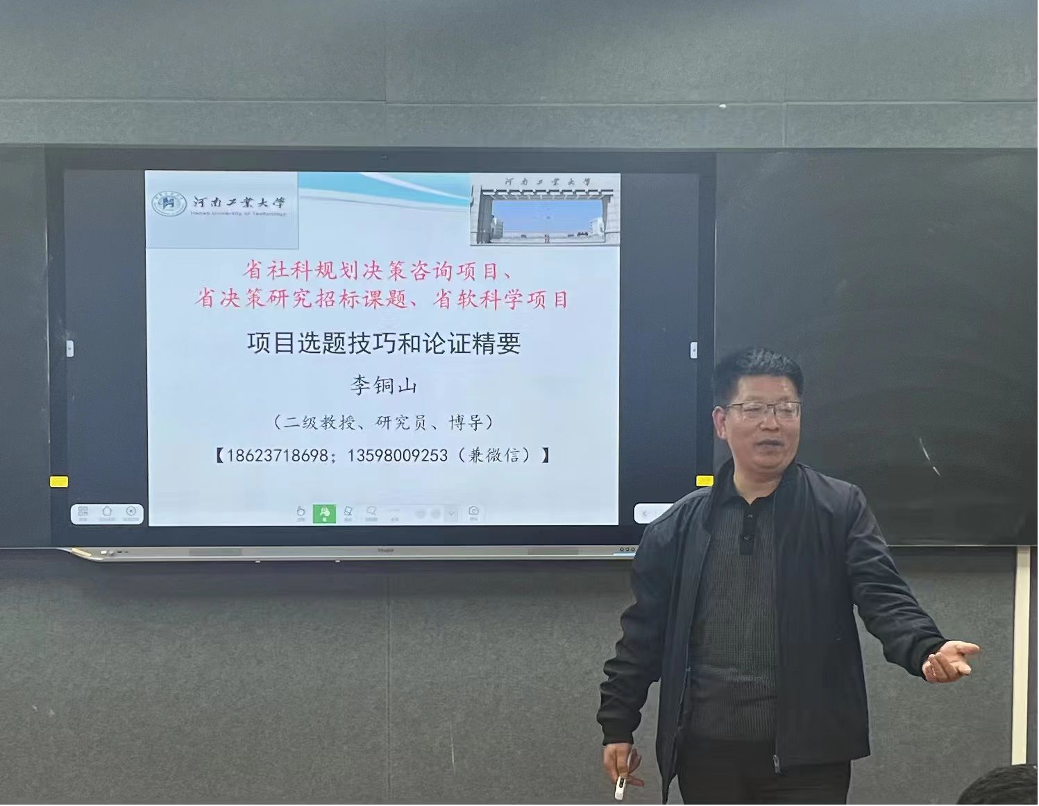 在第二场报告中,李铜山教授以“决策咨询类项目选题技巧和论证精要”为题,紧紧围绕选题的重要性、选题的基本着眼点、选题中必须树立的四大理念三个方面进行了生动的讲解。他还针对河南省社会科学规划决策咨询项目、河南省政府决策研究招标课题及河南省软科学项目的申报书如何论证作了深刻的剖析。