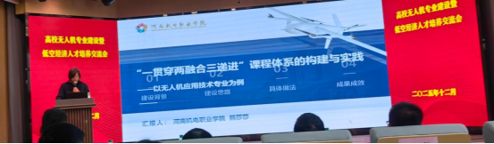 河南机电职业学院航空学院副院长熊莎莎作了题为《“一贯穿两融合三递进”课程体系的构建与实践——以无人机应用技术专业为例》的报告,深入阐释了如何以职业能力培养为主线,贯穿始终,融合理论与实践、技术与人文、专业与思政,并通过“基础-专项-综合”三阶段递进,系统构建无人机专业课程群。