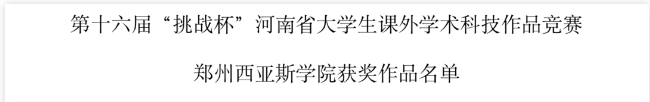 由共青团河南省委、河南省教育厅、河南省科学技术院、河南省科学技术协会、河南省学生联合会共同举办的2023年“挑战杯”河南省大学生课外学术科技作品竞赛圆满结束。我院推选作品荣获河南省一等奖1项,二等奖4项,三等奖11项。 2023年6月20日