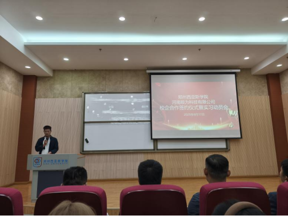 2025年9月17日,郑州西亚斯学院与河南顺为科技有限公司校企合作-校外实习基地落成签约仪式暨实习动员会在我校S02-017报告厅隆重开展,活动由我校经管学院电子商务系主任武胜良主持。经管学院副院长桂苹苹、科研办公室宋雨菲、河南顺为科技总经理卢文魁、京东科技负责人耿光辉、河南大学张嵩等出席会议。会上,武胜良阐述“产教融合、协同育人”主题并介绍参会嘉宾。活动的开展标志着双方产教融合合作启动,为校企人才对接搭起桥梁,对产学研融合与应用型人才培育意义重大。