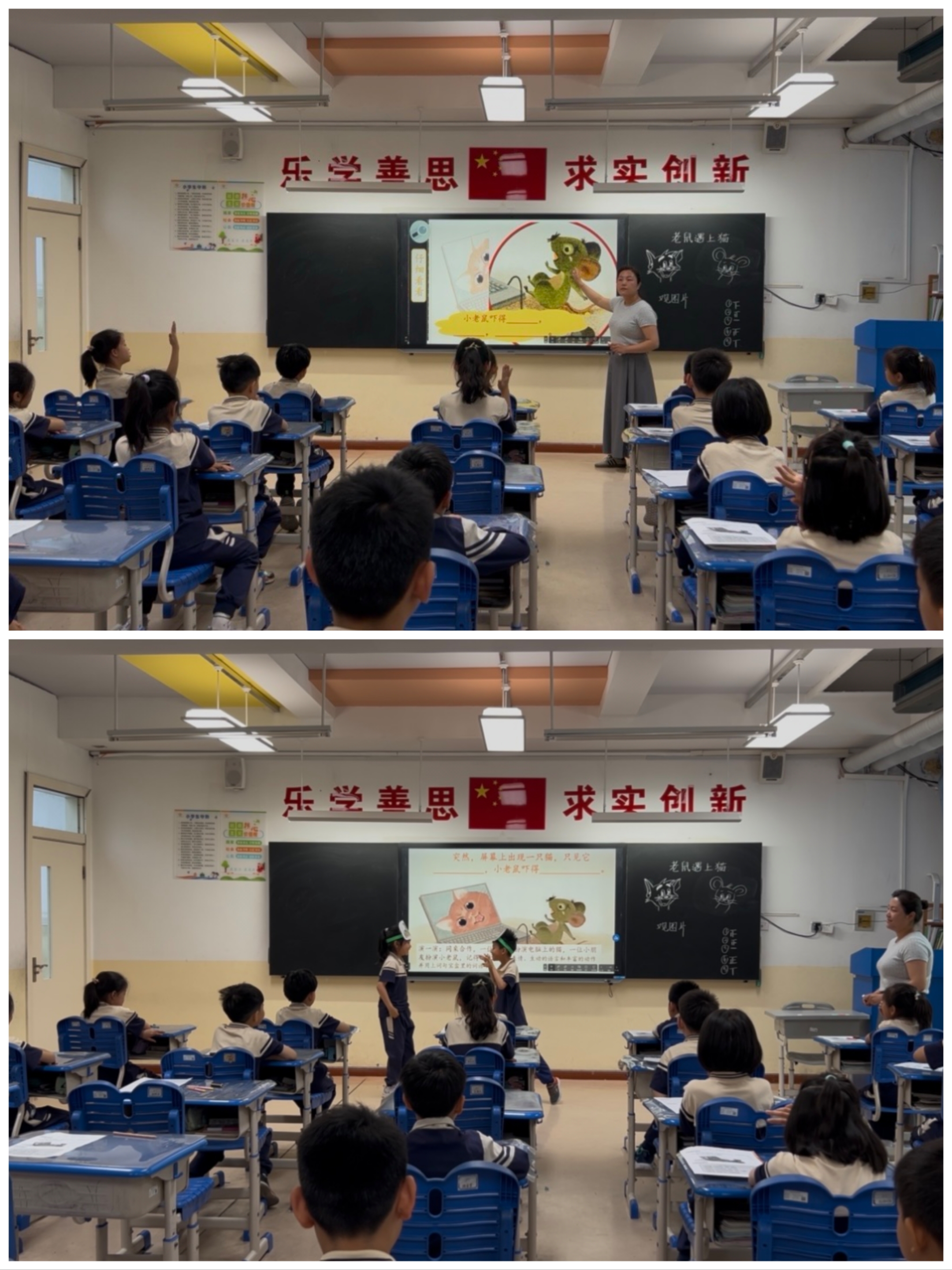 刘楠楠老师创设“华纳电影公司”招募编剧这一情境,通过播放《猫和老鼠》的精彩动画片,瞬间捉住学生们的目光。课堂上循序渐进地指导,先是引领学生观察图片、阐述意图,从整体到局部,细致入微地剖析猫和老鼠的特征,同时规范学生的语言表达。随后,又启发学生从故事的起因、角色的心理与语言、最终的结局等多个维度展开想象,丰富情节。最后,着重强调拟写标题的要点以及标点符号的规范运用,让学生能够有条不紊、清晰流畅地进行写作。