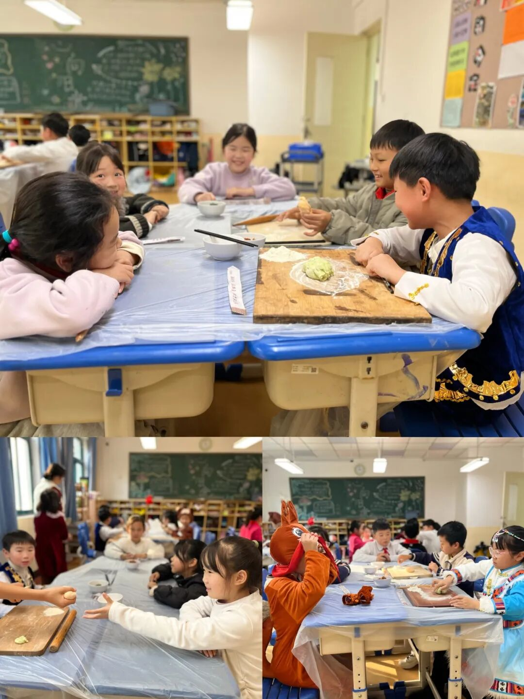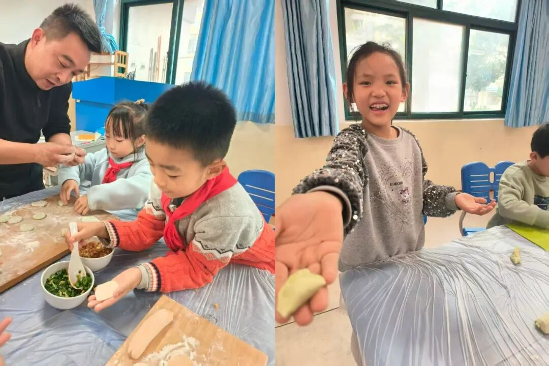 看!他们一个个有的擀面皮、有的包饺子; 一张张饺子皮在小手中翻飞,一个个形态各异的饺子很快呈现在大家面前,甭提多开心啦!