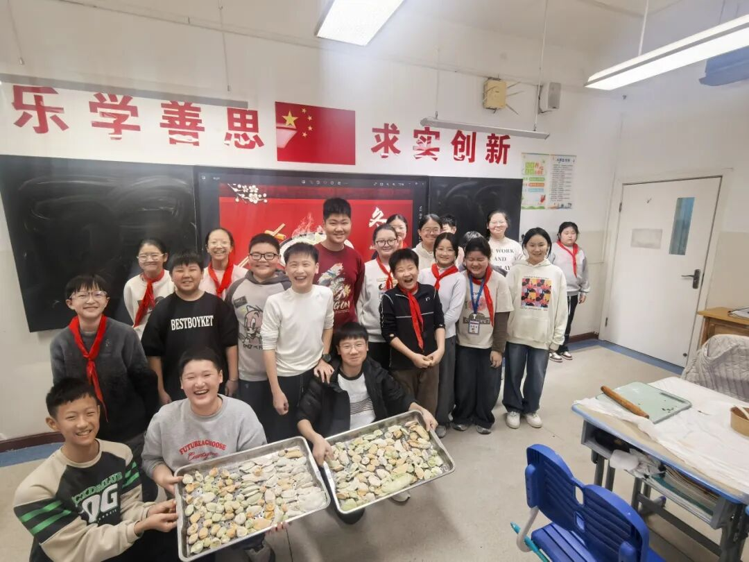 同学在老师的耐心指导下,认真领会包饺子的方法:将擀好的饺子皮放在手中,舀一勺鲜香的馅料,对折、捏边,有的还学着给饺子捏出漂亮的花纹。