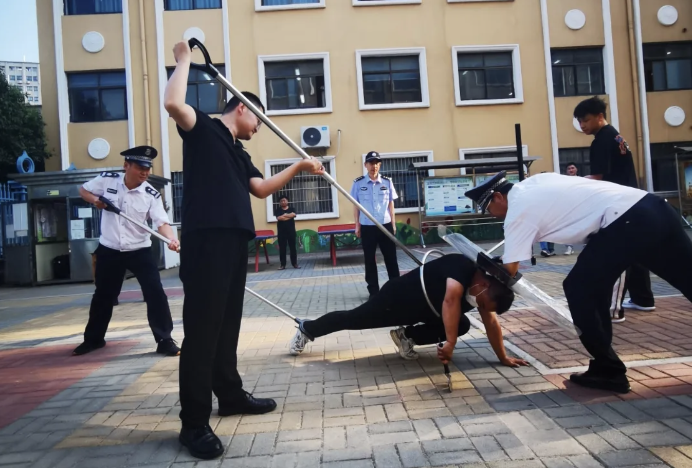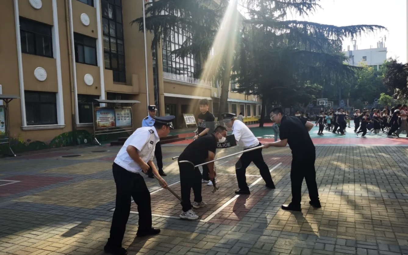 演练场景设定为学生们正在课间活动,课间值班老师及安全小组成员在操场等地方值班。这时,一名男子强行闯进学校,保安手持抓捕器具马上前去劝其停下,并命令其离开学校。但该男子不听劝告,继续往校内闯。保安在制止过程中,该男子突然拔出尖刀,刺向保安。另一名保安迅速反应,及时按响一键报警系统。同时,安保小组对犯罪分子进行抓捕。