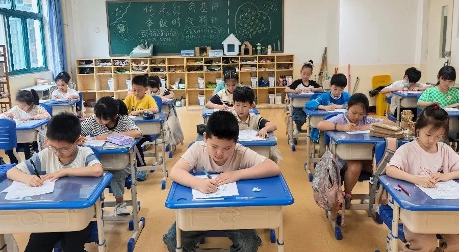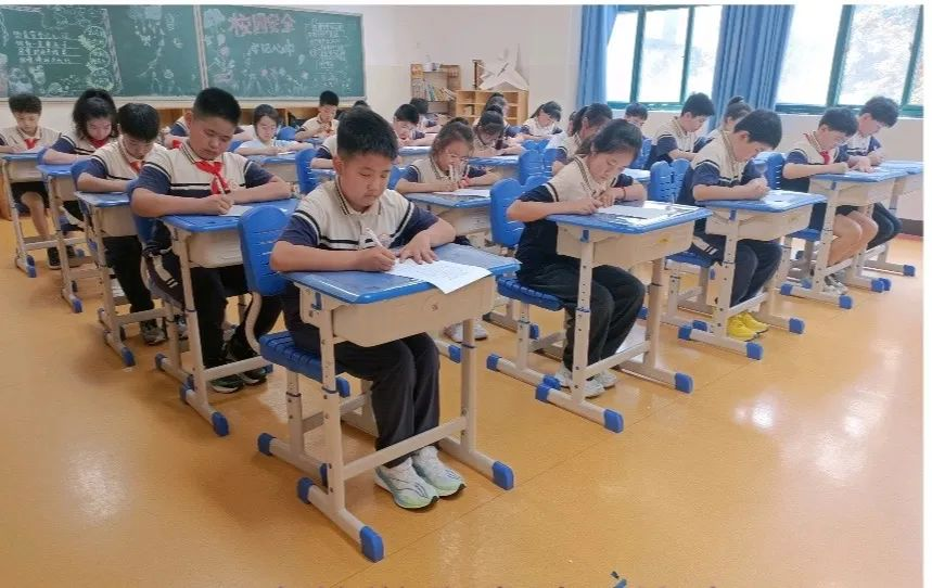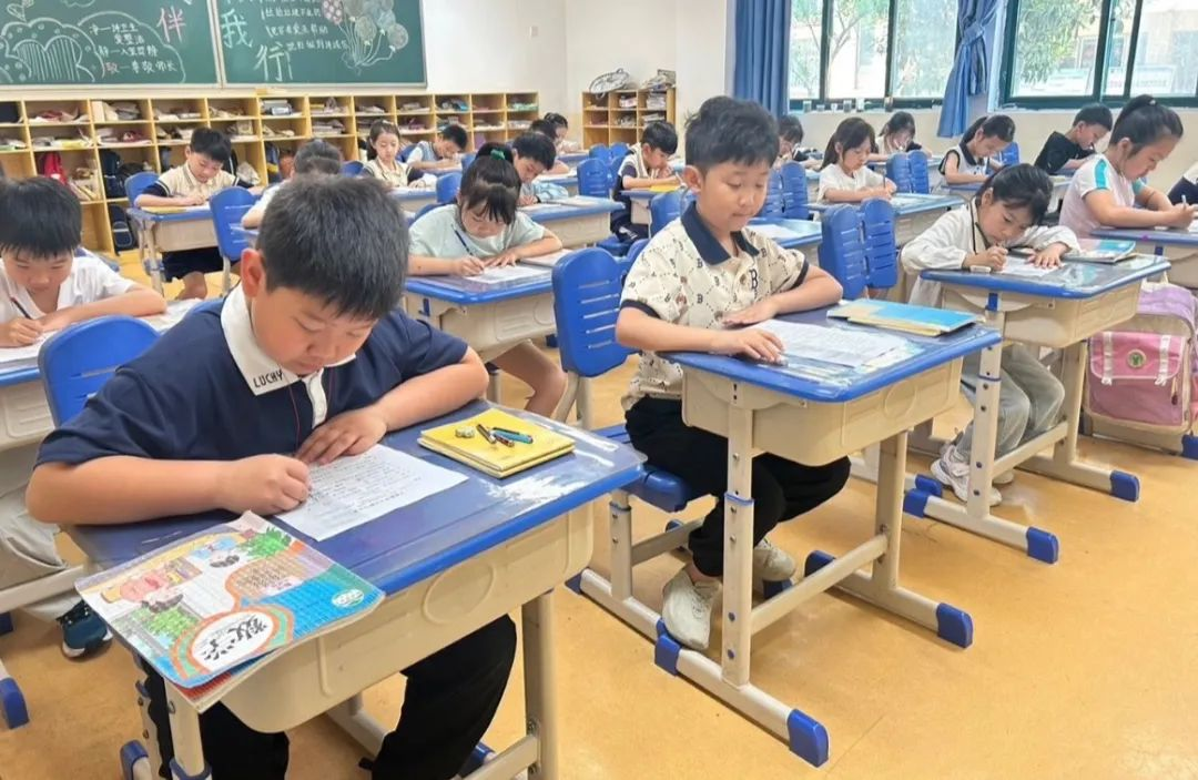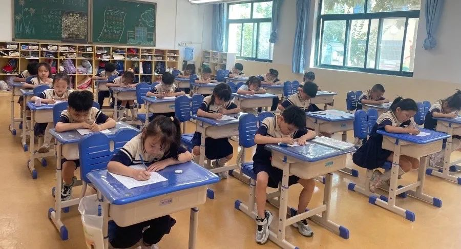低年级的学生激动又期待,一年级的小朋友是懵懂专注的初探者,他们握紧铅笔,边写边小声嘀咕,语气里透着认真与执着; 二年级的小朋友是渐入佳境的小能手,他们认真地默写“四则运算的运算顺序”,边写边想边嘀咕,语气自信中带点 “小老师” 的严谨。三年级的小朋友是条理清晰的挑战者,他们专注地默写着“长方形面积公式”“时分秒换算关系”,稚嫩的脸庞上满是认真!