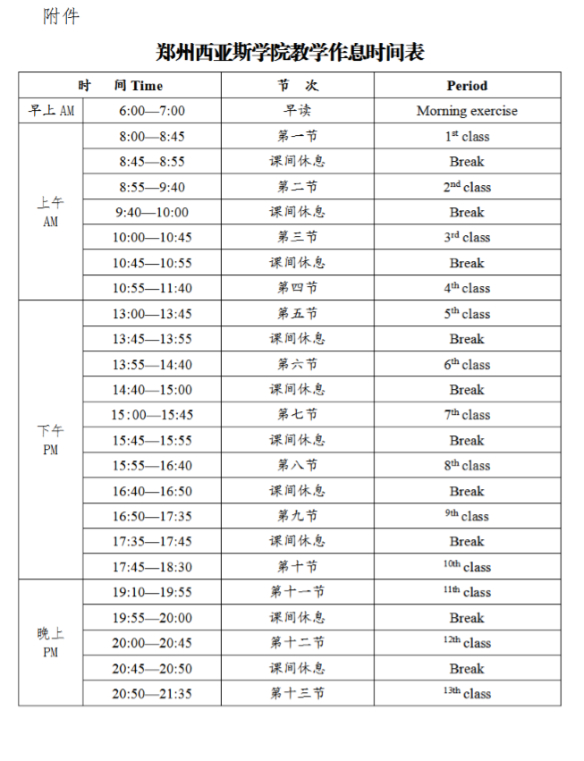 上午8:00—11:40,安排4节课;下午13:00-18:30,安排6节课;晚上19:10-21:35,安排3节课。调整后的作息时间安排见附件。
