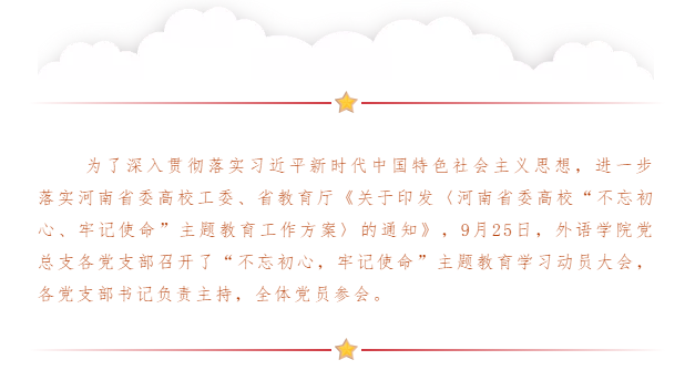 翻译系教工党支部动员大会由党支部书记樊晓培主持。在会议上,党员同志认真学习习近平总书记的两次重要讲话并分享各自的学习心得,支部书记做了此次主题教育活动的学习总计划,并督促所有支部党员重视此次主题教育活动的理论学习,提高认识,认真学习,并把学习的心得体会落实到工作中。
