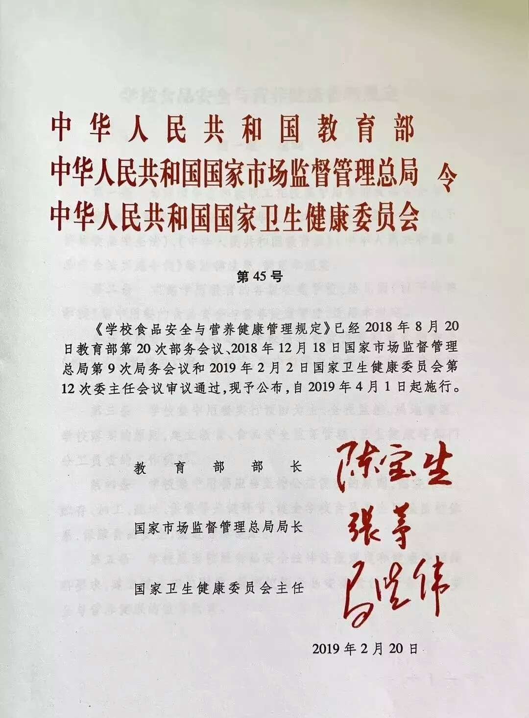 《学校食品安全与营养健康管理规定》已经2018年8月20日教育部第20次部务会议、2018年12月18日国家市场监督管理总局第9次局务会议和2019年2月2日国家卫生健康委员会第12次委主任会议审议通过,现予公布,自2019年4月1日起施行。