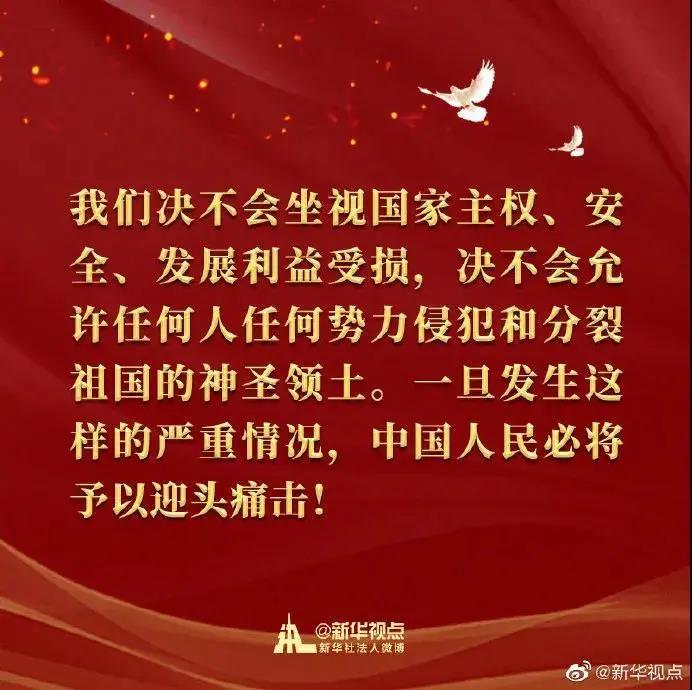 中国一贯奉行防御性国防政策,中国军队始终是维护世界和平的坚定力量。中国永远不称霸、不扩张,坚决反对霸权主义和强权政治。我们决不会坐视国家主权、安全、发展利益受损,决不会允许任何人任何势力侵犯和分裂祖国的神圣领土。一旦发生这样的严重情况,中国人民必将予以迎头痛击!