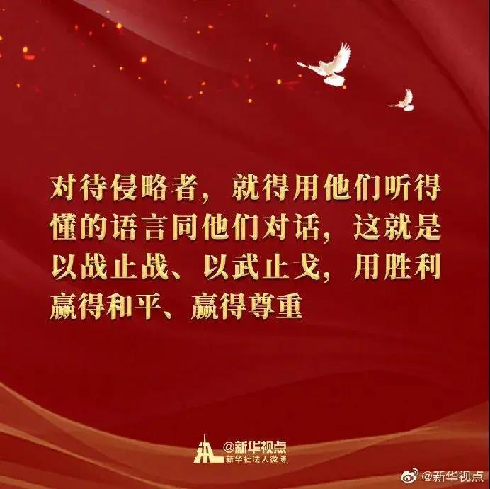 ——无论时代如何发展,我们都要砥砺不畏强暴、反抗强权的民族风骨。70年前,帝国主义侵略者将战火烧到了新中国的家门口。中国人民深知,对待侵略者,就得用他们听得懂的语言同他们对话,这就是以战止战、以武止戈,用胜利赢得和平、赢得尊重。中国人民不惹事也不怕事,在任何困难和风险面前,腿肚子不会抖,腰杆子不会弯,中华民族是吓不倒、压不垮的!