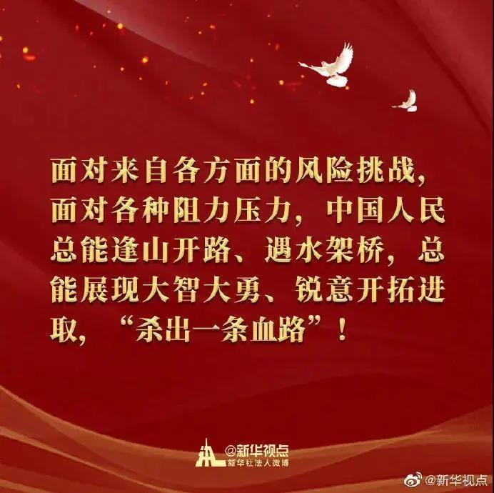——无论时代如何发展,我们都要激发守正创新、奋勇向前的民族智慧。勇于创新者进,善于创造者胜。志愿军将士面对陌生的战场、陌生的敌人,坚持“你打你的,我打我的,你打原子弹,我打手榴弹”,把灵活机动战略战术发挥得淋漓尽致。面对来自各方面的风险挑战,面对各种阻力压力,中国人民总能逢山开路、遇水架桥,总能展现大智大勇、锐意开拓进取,“杀出一条血路”!