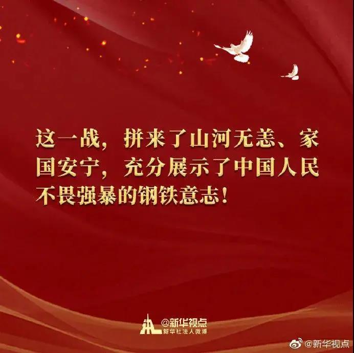 ——铭记伟大胜利,推进伟大事业,必须维护世界和平和正义,推动构建人类命运共同体。中华民族历来秉持“亲仁善邻”的理念。作为负责任大国,中国坚守和平、发展、公平、正义、民主、自由的全人类共同价值,坚持共商共建共享的全球治理观,坚定不移走和平发展、开放发展、合作发展、共同发展道路。只要坚持走和平发展道路,同各国人民一道推动构建人类命运共同体,就一定能够迎来人类和平与发展的美好未来!