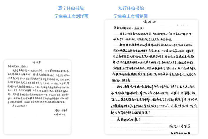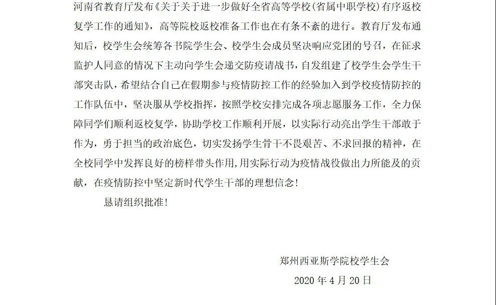 省教育厅发布通知后,西亚斯学生会学生干部坚决响应党团的号召,在征求监护人同意后主动向校学生会递交请战书希望参与到学校疫情防控的工作队伍中,校学生会迅速组建成立学生干部突击队,助力返校复学工作顺利开展。