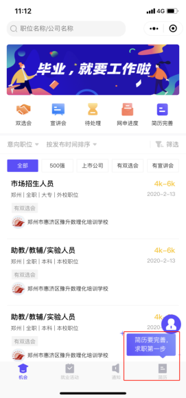 请按照提示完善你的求职意向、自我描述、语言能力、实习经历等相关求职信息,建议简历完整度不低于80%,便于HR更好地了解你,赢得就业机会。根据提示进行填写即可。