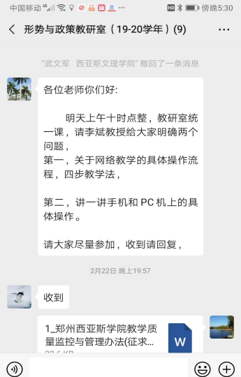 2月23日上午10点,《形势与政策》教研室通过微信视频会议形式,召开了教研室集体备课会议,教研室主任武文军教授提出“四步教学法”(第一步,组织签到;第二步,给学生布置本次课程的重点学习内容,指导学生学习;第三步,提出讨论题目,和学生互动;第四步,教师点评),以切实保障学生网上学习效果。为了让学生明确学习要求,马克思主义学院院长郭学德在学习平台发布了通知,明确告知学生网上学习注意事项。