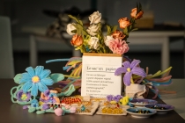活动开始前,师生们精心布置好了场地,桌上摆满了精美绝伦的花束贺卡,还有各式各样的手工材料:扭扭棒、弹力绳、水晶串珠……每一份材料都承载着我院暖暖的心意和沉甸甸的祝福。