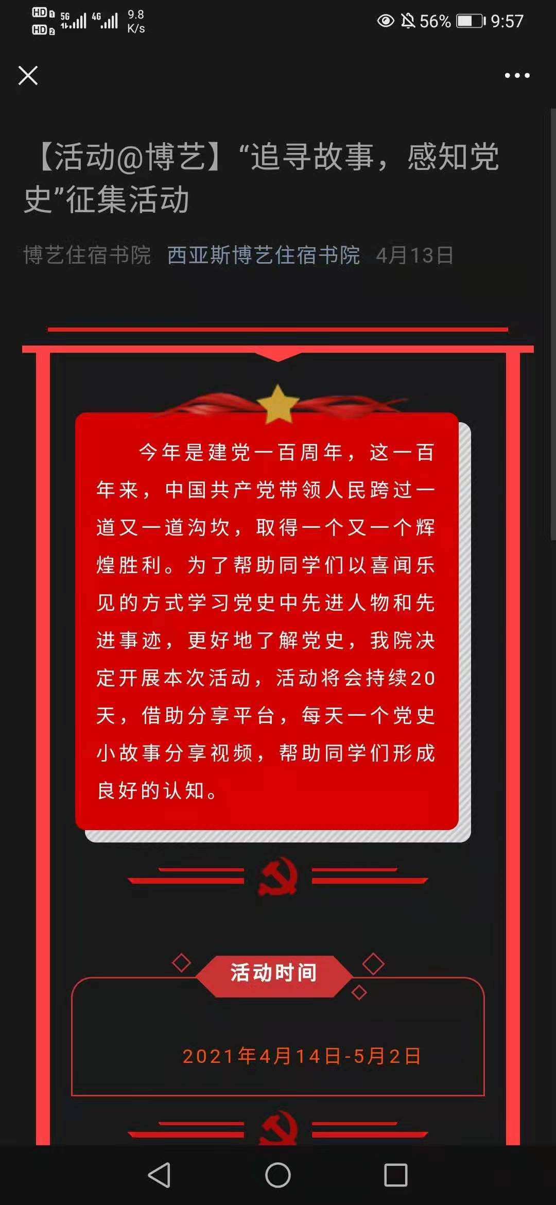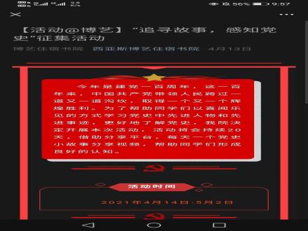 为响应书院号召,督促同学们在闲暇时间中能更好的了解党史,在4月13号到5月13号期间,博艺住宿书院分团委学生会举行了“追寻故事,感知党史”党史故事分享。