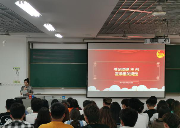 典礼进行第二项:由分团委书记助理王彤同学宣读建党百年朋辈大讲堂的相关规定。