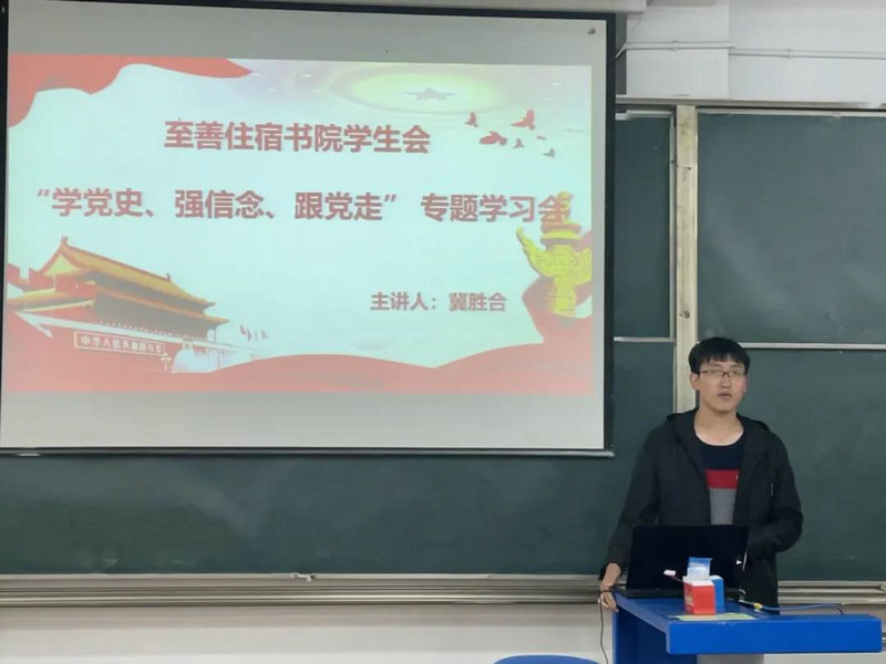 2021年是中国共产党成立一百周年。一百年初心不变,一百年砥砺前行。一百年里,中国共产党带领中华民族奋勇向前,书写了波澜壮阔的历史长卷。为迎接建党一百周年,以党的奋斗历程和伟大成就鼓舞广大青年的斗志,使青年学子明确未来的发展方向,用党的光荣传统和优良作风引领广大青年学生坚定理想信念,为实现中华民族伟大复兴的中国梦贡献青春力量,至善住宿书院于4月26日在6号楼201教室开展了“学党史、强信念、跟党走”为主题的教育活动。本次活动主讲人为至善住宿书院分团委书记冀胜合,参会人员为全体学生会干部。