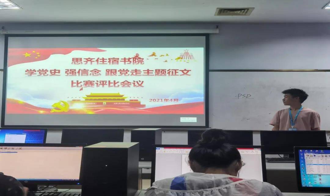 为庆祝中国共产党成立100周年,深入贯彻落实习近平总书记在党史学习教育动员大会上的讲话精神及团中央《关于在团中央直属机关开展党史学习教育的通知》的文件要求,思齐住宿书院分团委于5月10日在11号楼214教室开展“学党史 强信念 跟党走”主题征文评选活动。