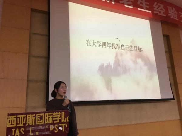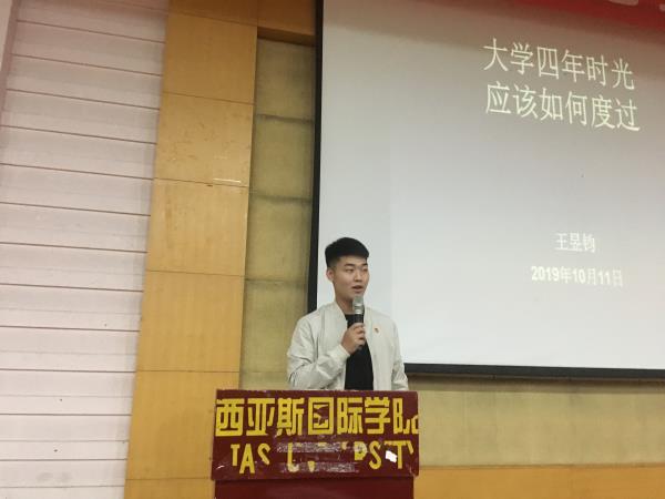接着,由各专业学院各年级的老生学生代表进行分享,2016级电子信息工程学院自动化专业的王昱钧学长为大家分享了个人在大学中的经历并提出“我们应该如何度过大学四年?”这个问题,讲述了每个人在大学中要找寻自己热爱的一个目标,然后为之努力奋斗。最后,他衷心希望学弟学妹们有个美好的未来。2016级堪萨斯国际学院双学位信息管理与信息系统专业的张迎宾学长为大家分享了他的生活经验,他主要讲解了他充实的大学生活,同时他希望大家可以深入了解到我院的文化特色,以及参加我院举办的活动等,张学长希望19级的新生们可以充实的过好每一天。2017级堪萨斯国际学院双学位国际经济与贸易专业的付若涵学姐,主要讲述的是大家在大学四年里应该要多思考,多聆听,多尝试,有目标,有激情,要做一个有抱负的人,付若涵学姐告诉大家在大学四年里提前规划自己的目标定位并且成功。2017级堪萨斯国际学院双学位护理专业的曹静怡学姐,主要给大家分享的是关于她的学习经验,并为大家推荐了一些关于护理专业的英文电影,可以提高专业英语词汇量,分享了自己在假期里的实习经历。最后她希望学弟学妹们可以学好自己的专业知识,提高自身能力。2018级会计学院会计学专业的李嵩源学长,主要讲解了一下会计学院的简介以及会计专业的发展前景,还分享了关于自己的一些经历。最后他希望19级新生们可以在未来坚持自己的初心,并想清楚自己对未来的展望。