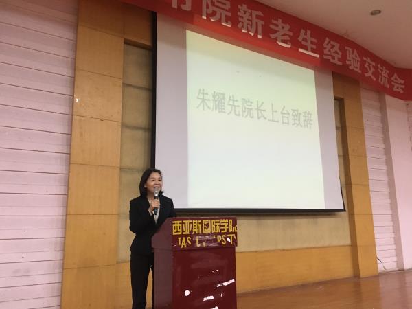 朱院长就此次活动的重要性和活动的意义做出了两点分享。首先,这次学习经验交流会非常有必要。学长学姐们的有所感悟、有所思考、有所总结、有所升华,获得了学习体会,积累了丰富经验。我相信他们的学习感悟、学习经验对促进你们的学习、提高学习效率和质量,会起到非常好的启迪和引领指导作用。其次,这次学习经验交流会非常有意义。经验交流会是一个先行者对后来者的心迹披露和心灵感染,也是相互学习、相互交流、相互借鉴、相互影响的一个好的形式。这种经验传授使新生较快找到学习的捷径,进入学习的佳境,从而达到事半功倍的效果。我希望把这种经验分享形式发扬光大传递下去,希望在学长学姐们的启发和影响下,将来你们成为学长学姐们后也会对你们的学弟学妹传递更有价值更有意义的学习体会和经验。