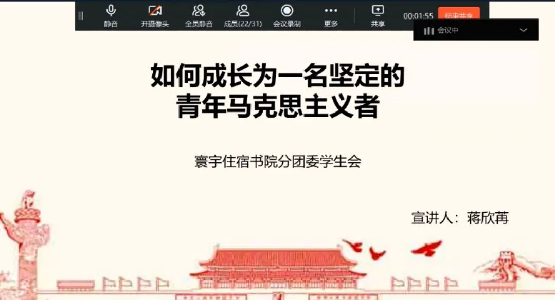 为让寰宇住宿书院分团委团学干部深刻感悟到马克思主义穿越浩荡时空的真理力量,使他们深刻意识到做好思想引领工作的根本前提是要明确马克思主义是我们立党立国的根本指导思想,帮助寰宇住宿书院分团委团学干部在实际工作中时刻明确永远听党话、跟党走的理想信念,同时提高思想政治素质,为实现中华民族伟大复兴贡献力量。寰宇住宿书院青马社团于2021年10月15日在线上开展“如何成长为一名坚定的马克思主义者”的主题宣讲活动。本次宣讲活动由青马社团副团长蒋欣苒主持。