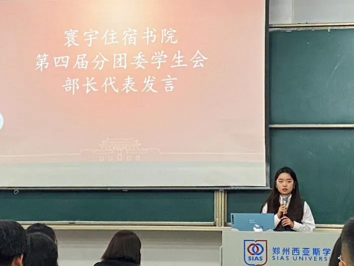 随后,寰宇住宿书院第三届分团委学生会主席团代表王彤同学、第四届分团委学生会主席团代表牛森同学、第四届分团委学生会干事代表曹赛一同学、第四届分团委学生会部长代表朱琛星同学先后进行发言,他们强调学生应做到独立思考,谨言慎行,勇于开拓新理念,坚持踏实做事。并鼓励新干事珍惜时机,保持热爱,坚守初心,不骄不躁,通过实践明白身为分团委学生会的一份子身上的责任与担当。同时也指出部长们作为团学干部成员,要以身作则,提高政治思想站位,树立良好的干部形象,起好模范带头作用。