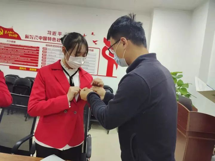随后,岳鹏辉老师为学生代表佩戴团徽。紧紧别在胸口的团徽不仅是一种荣誉的象征,更是一份沉甸甸的责任。