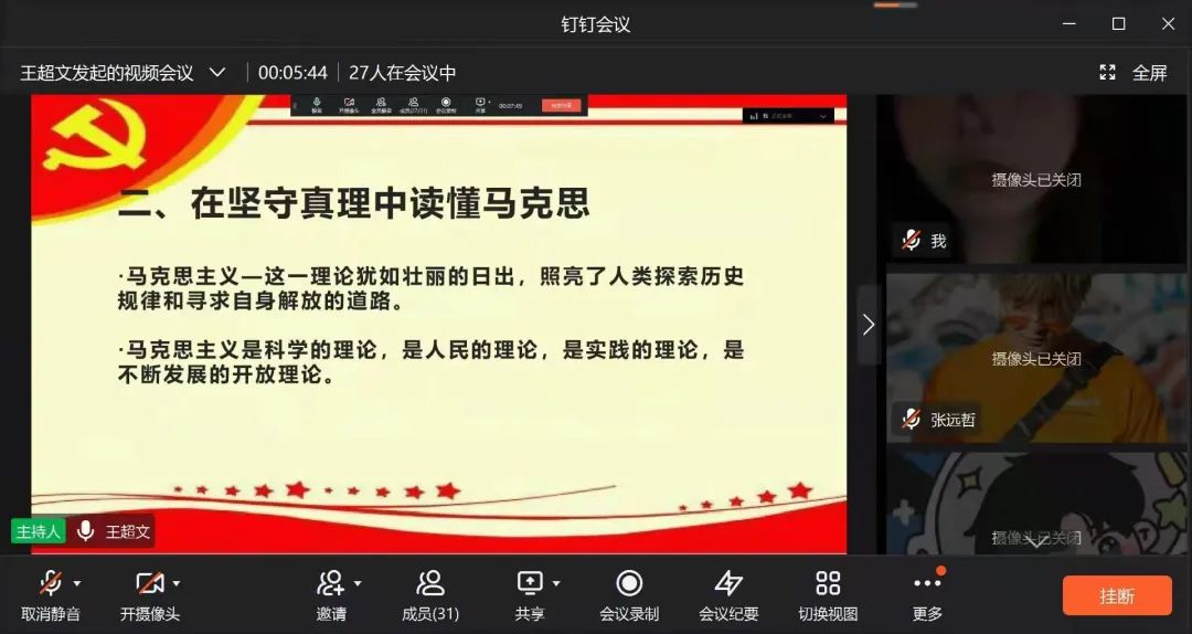 为让我院学生深入了解马克思,提高思想政治素质,加强马克思主义理论修养,使他们深刻意识到做好思想引领工作的根本前提是要明确马克思主义是我们立党立国的根本指导思想。寰宇住宿书院青马社团于2022年4月1日在线上开展“致敬马克思”主题宣讲活动。本次宣讲活动由青马社团学员王超文主持。