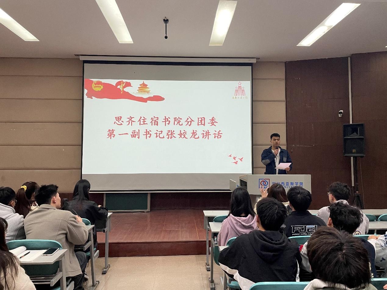接着,由思齐住宿书院分团委书记杨娇老师进行重要讲话,首先她对此次团课培训做出贡献的老师们和工作人员表达了感谢,也祝愿全体学员都能取得好成绩。强调了团校培训的纪律,并给学员们讲解团课的第一课。新时代新气象,作为团员的我们也要做出新的改变,我们也应当时刻谨记自身责任担当,同时主动提高自己的政治觉悟,积极参加活动,为书院发展出一份力。