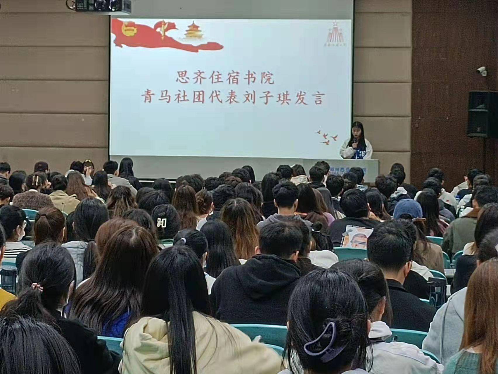 随后,由青马社团代表刘子琪同学发言,她向我们讲述了青马工程的开端以及对青年引领的重大意义。“青马工程”着力为党培养新时代坚定的马克思主义者,事关青年一代的成长发展,事关中国未来发展方向,事关中华民族伟大复兴的中国梦。当代中国青年与新时代同步前行,既是现在的主力军,也是未来的主力军,必将肩负起全面建设社会主义现代化国家的使命。努力成为一名新时代合格的马克思主义者与优秀中国青年,不负青春,不负人民,是当代青年的必然选择。
