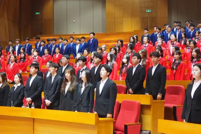 大会第二项,全体参会者起立奏唱中华人民共和国国歌及共青团团歌《光荣啊,中国共青团》。