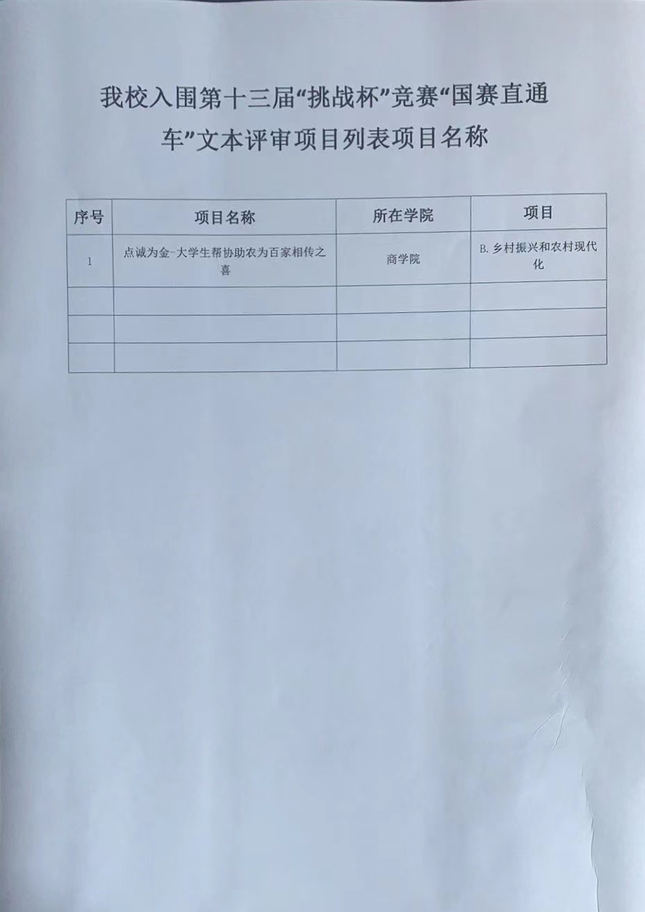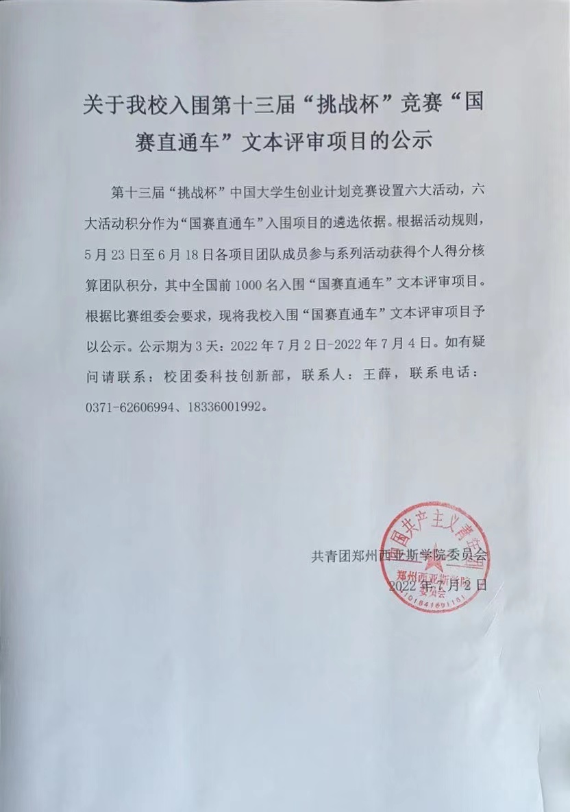 第十三届“挑战杯”中国大学生创业计划竞赛设置六大活动,六大活动积分作为“国赛直通车”入围项目的遴选依据。根据活动规则,5月23日至6月18日各项目团队成员参与系列活动获得个人得分核算团队积分,其中全国前1000名入围“国赛直通车”文本评审项目。根据比赛组委会要求,现将我校入围“国赛直通车”文本评审项目予以公示。公示期为3天:2022年7月2日-2022年7月4日。如有疑问请联系:校团委科技创新部,联系人:王薛,联系电话:0371-62606994、18336001992。