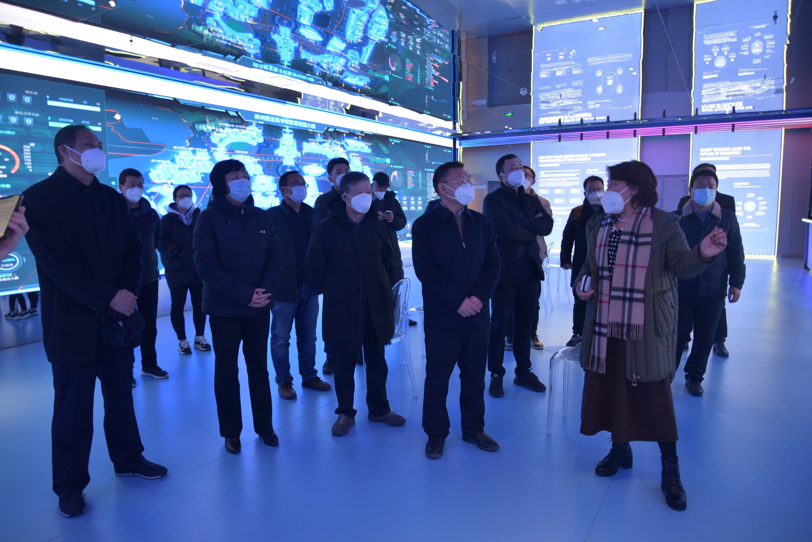 厅领导实地查看了全息智慧教室、3D资源创作室、裸眼3D互动空间、智慧应用展厅,详细了解了学校一网通办、教学无感知督导、教学资源创新、数据治理服务、学院一张表、师生一张表、数字孪生校园等建设和应用情况,并同学校相关职能部门负责人进行了交流。