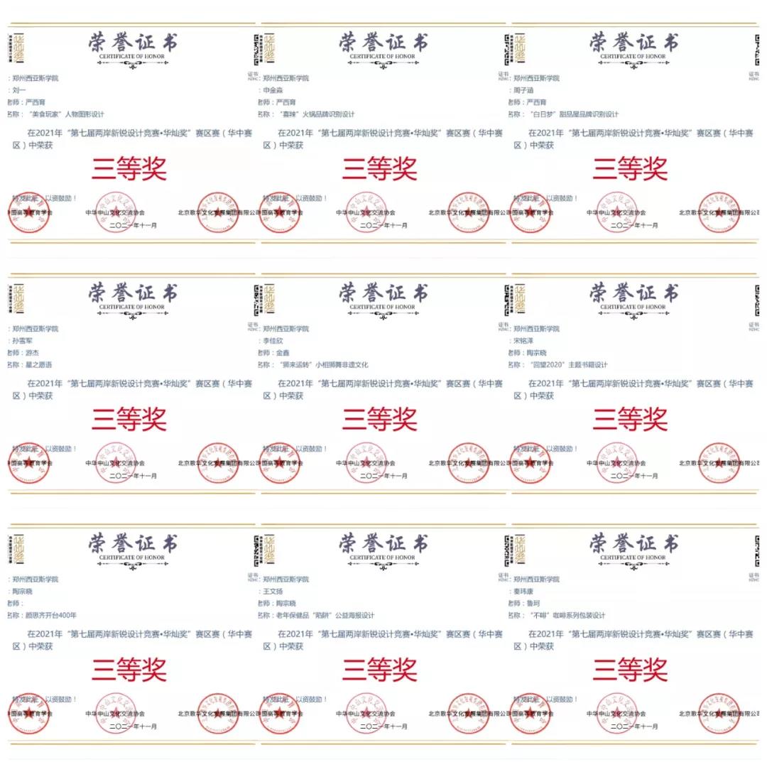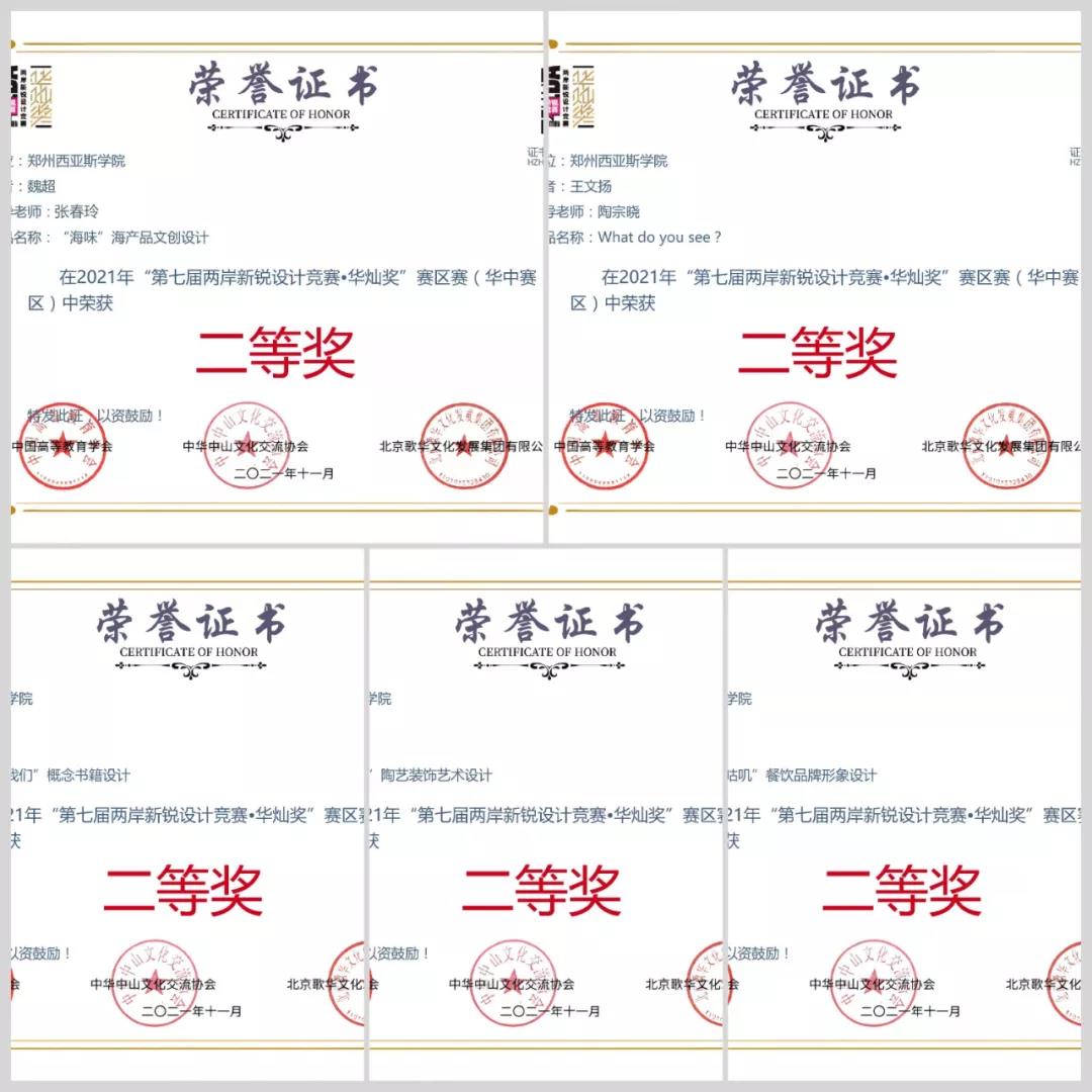 近日,由中国高等教育学会、中华中山文化交流协会、北京歌华文化发展集团联合主办第七届两岸新锐设计竞赛·华灿奖圆满结束,郑州西亚斯学院艺术设计学院学生在学院老师的指导下,认真准备、大胆创新,经过层层角逐,最终取得了4项国奖、24项赛区奖的好成绩!其中,荣获国家级三等奖1项、国家级优秀奖3项;华中赛区一等奖5项、华中赛区二等奖6项、华中赛区三等奖13项!