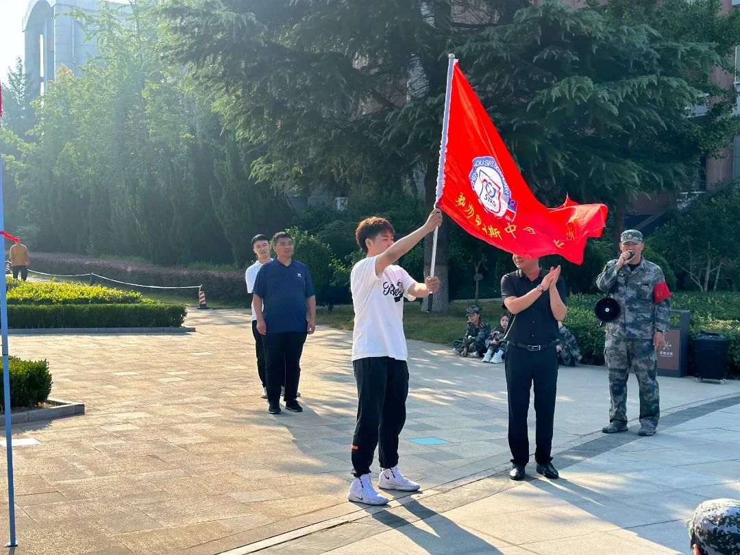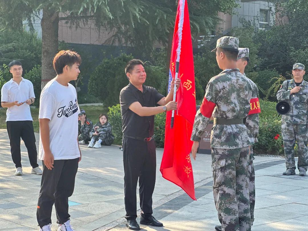 随后,冯伟副校长向军训连队代表授旗。鲜艳的旗帜,寄托着学校对全体新生的嘱托与期望。同时,也承载着青少年的责任、使命与担当。