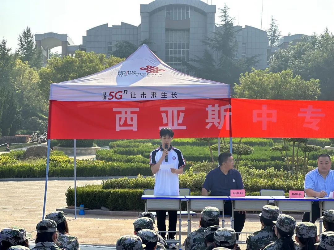 紧接着,二年级计算机二班轩恒同学代表全体参训学生发言。他号召同学们以军人的标准严格要求自己,听从指挥,刻苦训练,超越自我,用向下扎根的力量和向阳而生的勇气,用饱满的热情和昂扬的斗志充分展现西亚斯中专学子的风采。