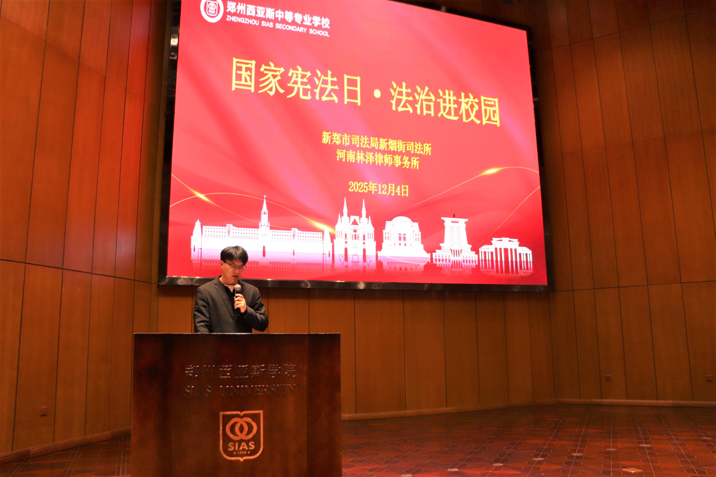 2025年12月4日是我国第十二个“国家宪法日”。我校举办“法治进校园”主题讲座,特邀我校法制副校长、新郑市司法局新烟街司法所所长王蒙,副所长陈保磊,高媛媛老师,河南林泽律师事务所胡春河老师莅临指导。胡春河老师以真实案例解读刑事责任年龄及未成年人不良行为,引导学生知法守法。活动强调家校社协同育人,我校将持续推进法治教育常态化,筑牢未成年人保护屏障,助力平安校园建设。